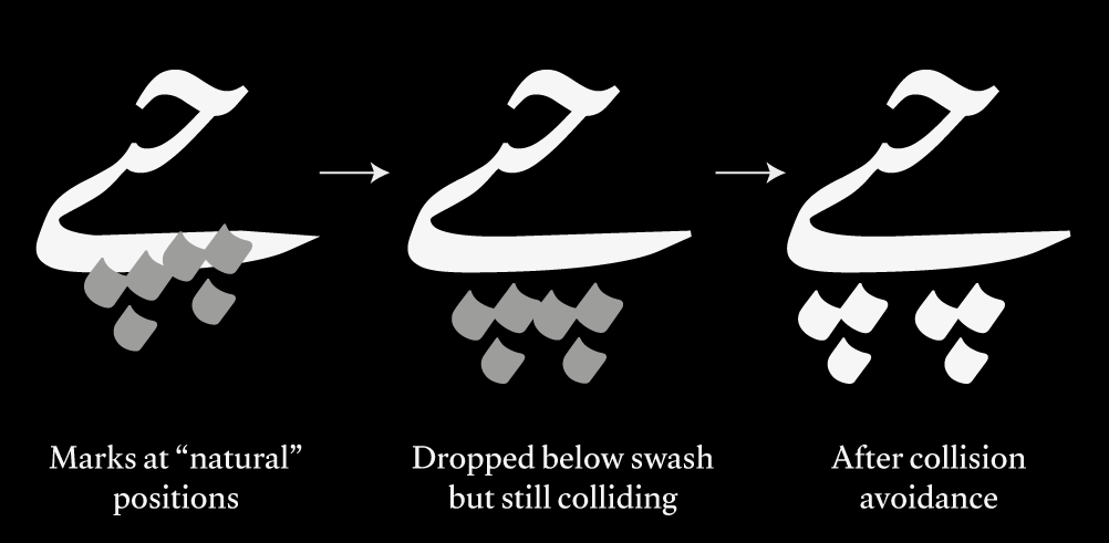 Special handling of baṛī ye and other sequences was achieved through a combination of techniques: substituting mark glyphs affected by the baṛī ye swash by unanchored variants allows them to be removed from the normal positioning system, and then a similar collision avoidance algorithm to that described above is applied to identify sequences which need to be repositioned (fig 12); for other glyphs which have smaller rightward strokes that only affect a single previous glyph, contextual positioning rules achieved the same objective.