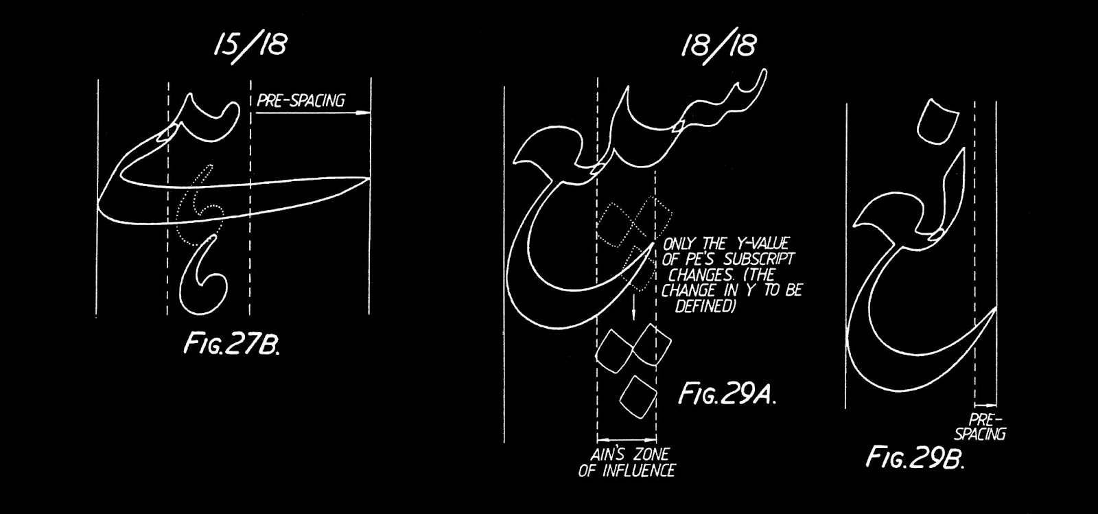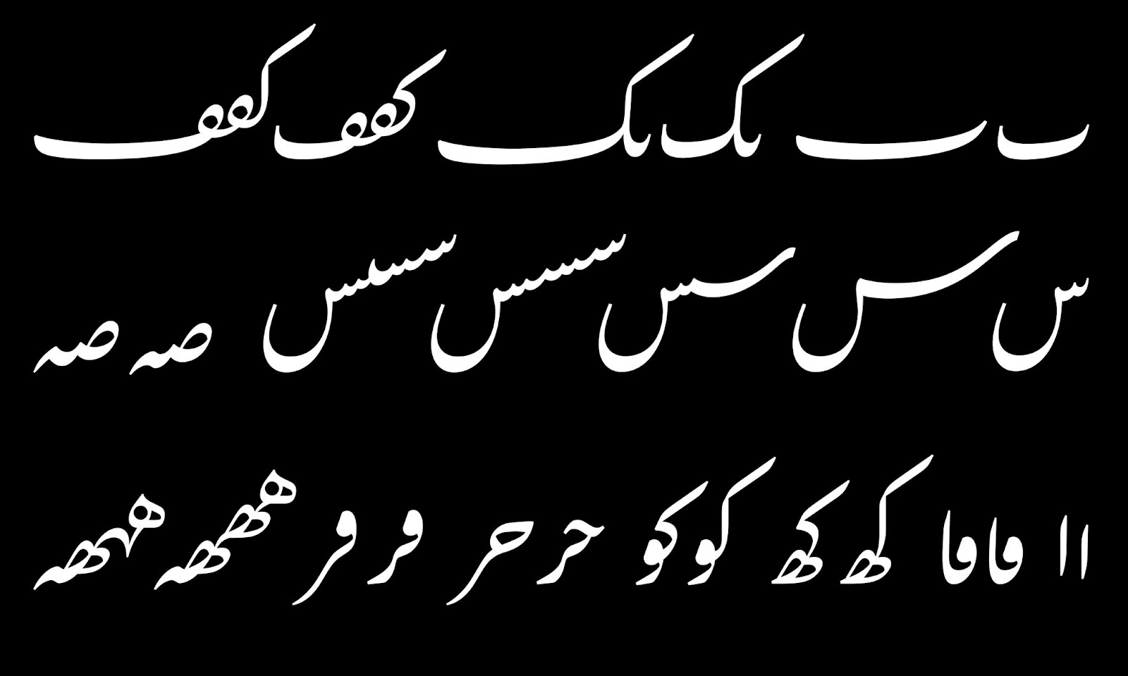 In Sheeraz and Qalmi, each undotted letter (called rasm in Arabic) consisted of a group of initial, medial, final and unconnected variants and alternatives. Most of the connecting forms, such as those displayed in Fig 6, were designed with entry and exit strokes which would overlap to make the cursive connection. This was further modified in Gulzar; instead of adding both entry and exit strokes, each character has only an exit stroke, specifically designed to match the character following it (Fig 7). Thanks to this approach, the initial forms of letter groups could also be re-used as components in the medial position. This not only reduced the number of glyphs which needed to be designed, but also ensured smooth and seamless connections.