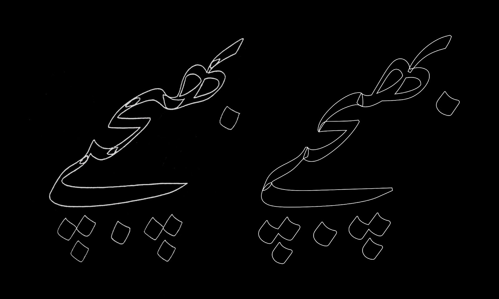 Fig 5. Calligraphic form of the letter ain (left) and several stages of its development to achieve the most appropriate form (from left to right).