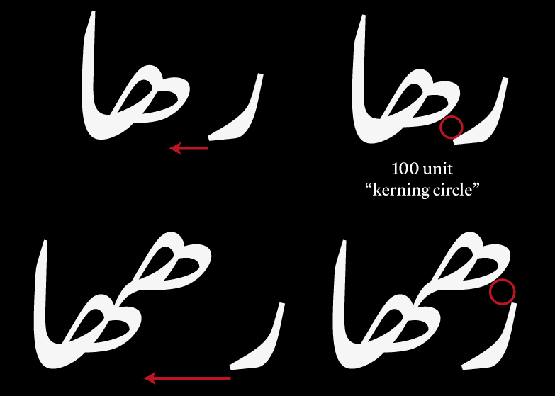 With contextual glyph substitution and decomposition in place, the major engineering requirements of a Nastal’iq design are the correct placement of dots; achieving tight but even fitting; and the special handling of certain characters which impact upon text to their right (particular baṛī ye, but also final jim, ain, and choti ye).