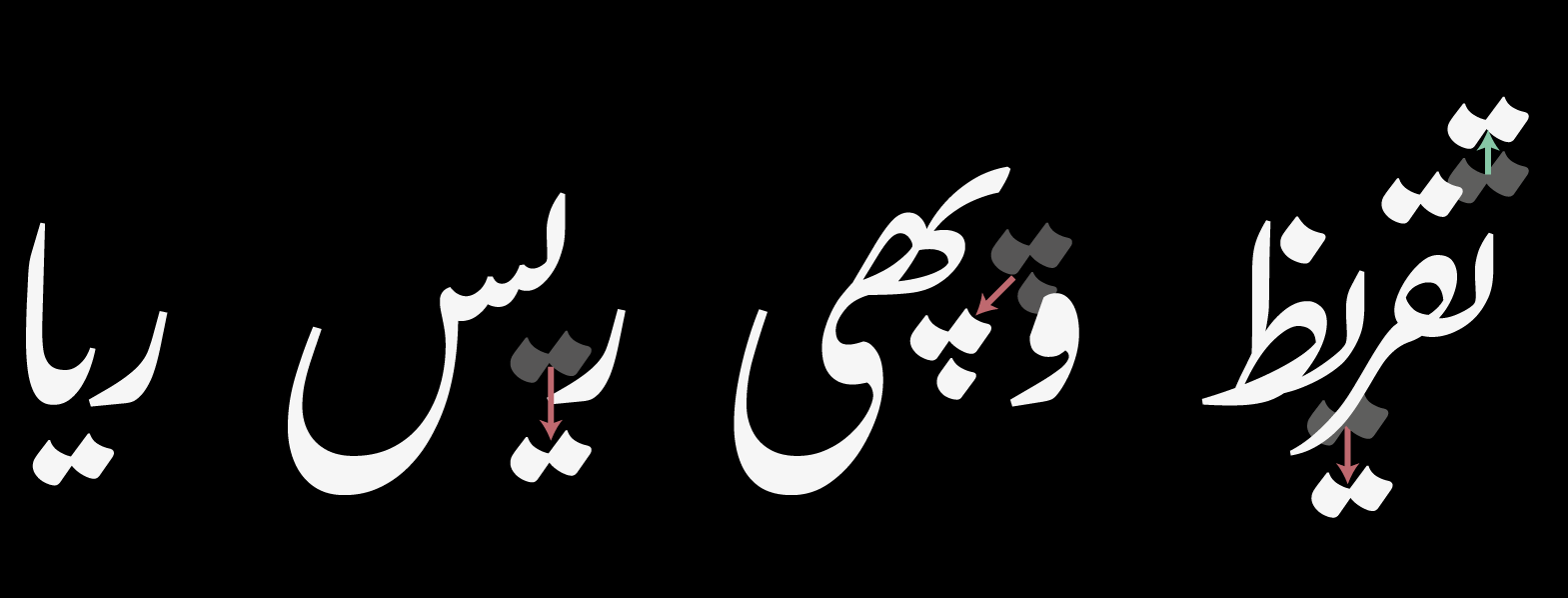 Overall, the combination of these techniques provides a tighter fitting and more natural layout than other Nastal’iq OpenType fonts, at the cost of considerable technological complexity - at many points during the development of the font, the font refused to compile due to the large number of contextual rules! However, we found ways to compact the layout in order to provide both a performant and aesthetically pleasing result.